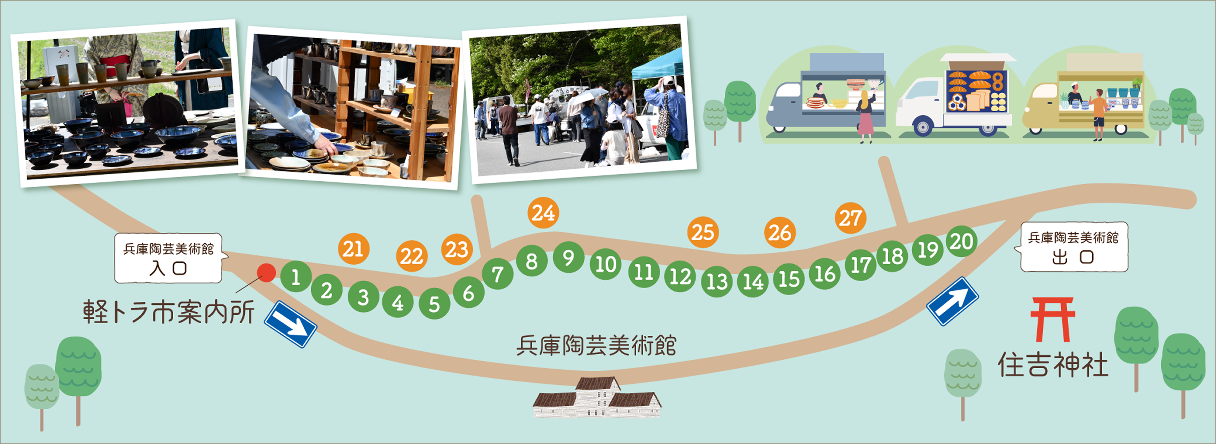 今年の春の軽トラ市には21軒の窯元(軽トラ20台)と、7軒の物産・飲食店が出店。